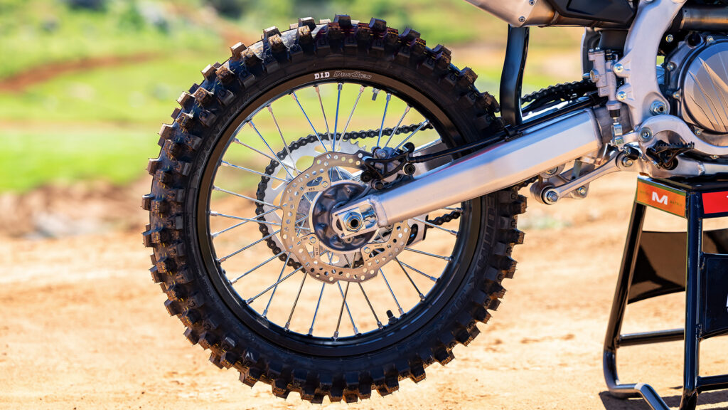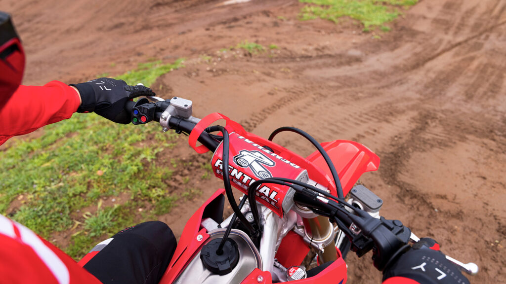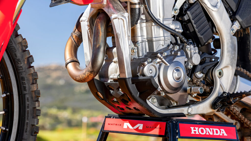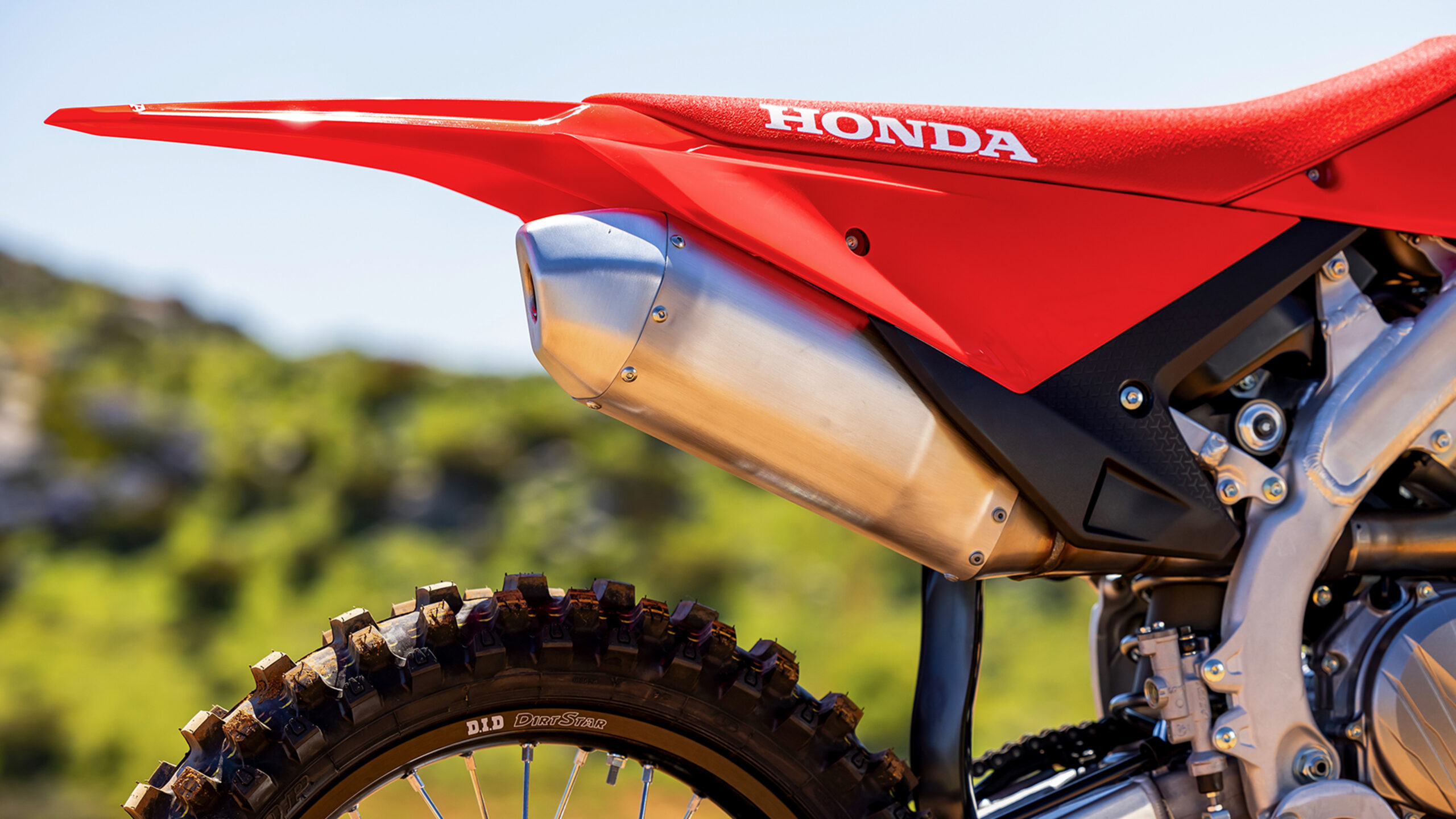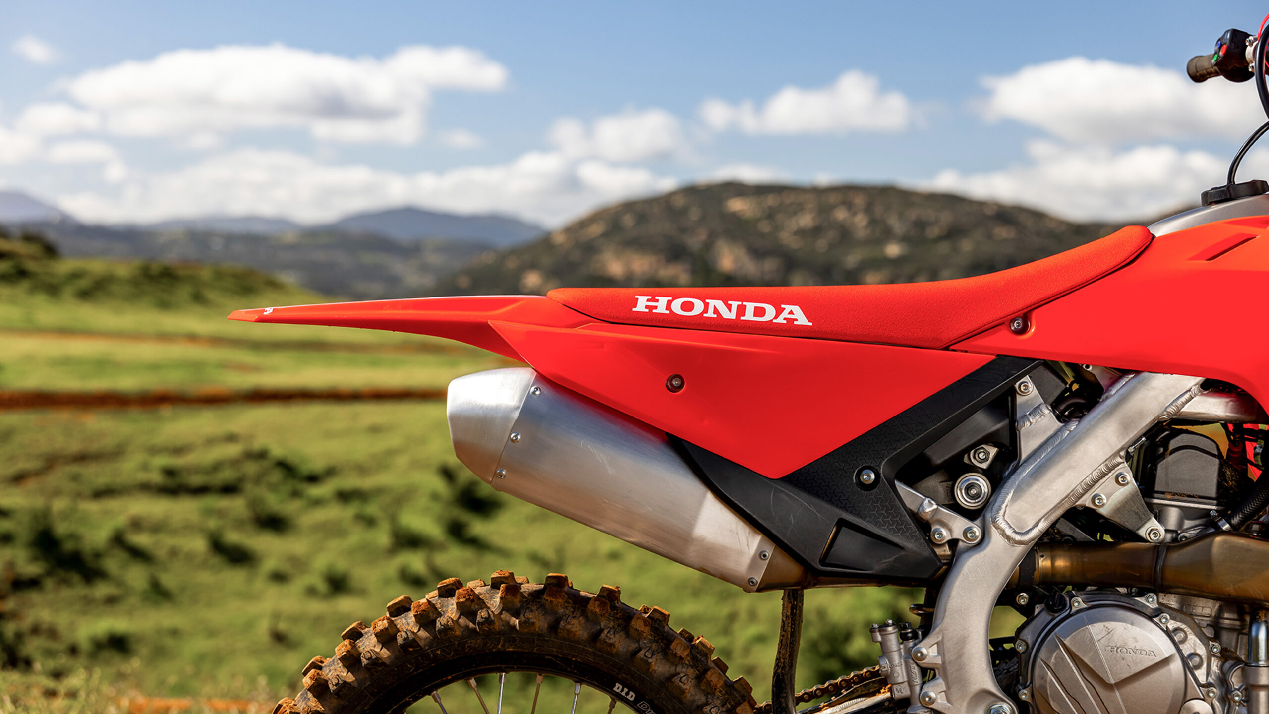 Para que a ciclística seja perfeita, o quadro da CRF 450R está cerca de 650g mais leve que a geração anterior e possui longarinas menos espessas. O chassi também ficou mais responsivo ao ajustar a rigidez lateral, para que a moto entre e saia mais rápido das curvas.
