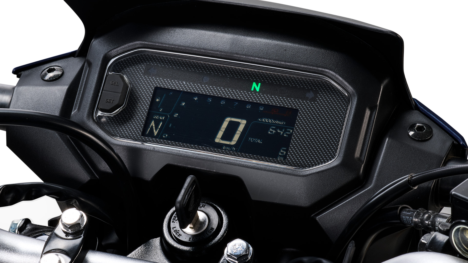 O painel digital blackout da XRE 190 traz um visual moderno, com indicador de marcha e consumo instantâneo de combustível, para uma experiência ainda mais completa.